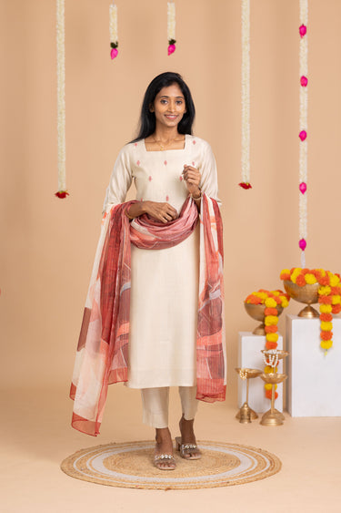 The Creamy 3-Piece Suit is a timeless blend of elegance and comfort, designed to make every festive moment feel special. Crafted in soft, breathable fabric with delicate embroidery, this set brings effortless grace to your festive wardrobe.