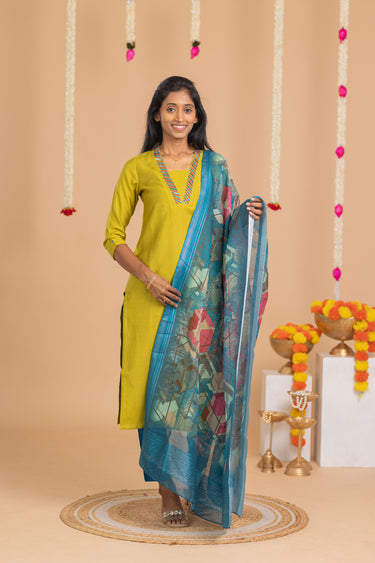 Crafted in a lively lime green hue, this elegant 3-piece ensemble features a beautifully stitched kurta with a detailed neckline, paired with sleek matching pants for effortless comfort. The look is completed with a striking printed dupatta in shades of teal and red, adding a contemporary artistic twist.