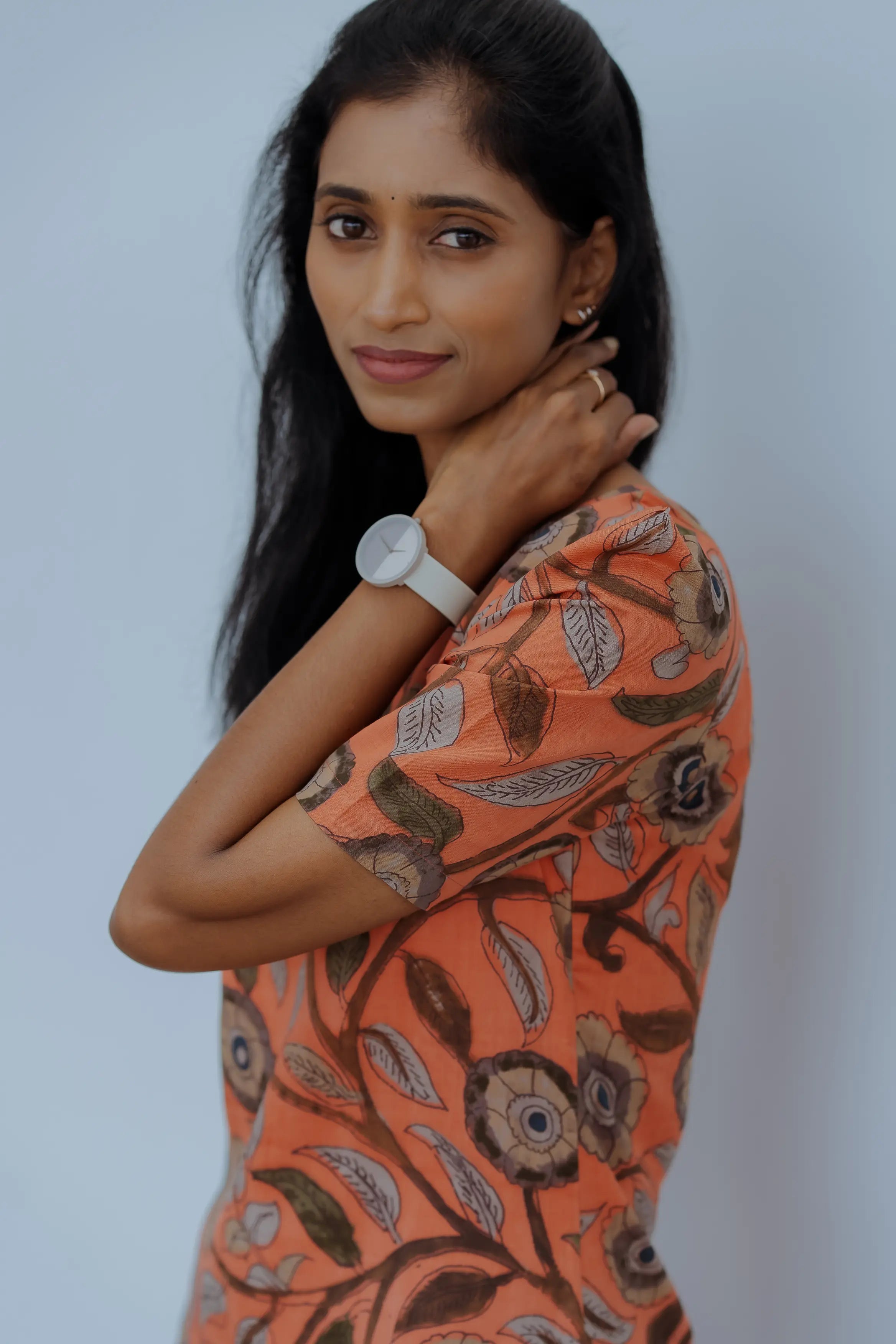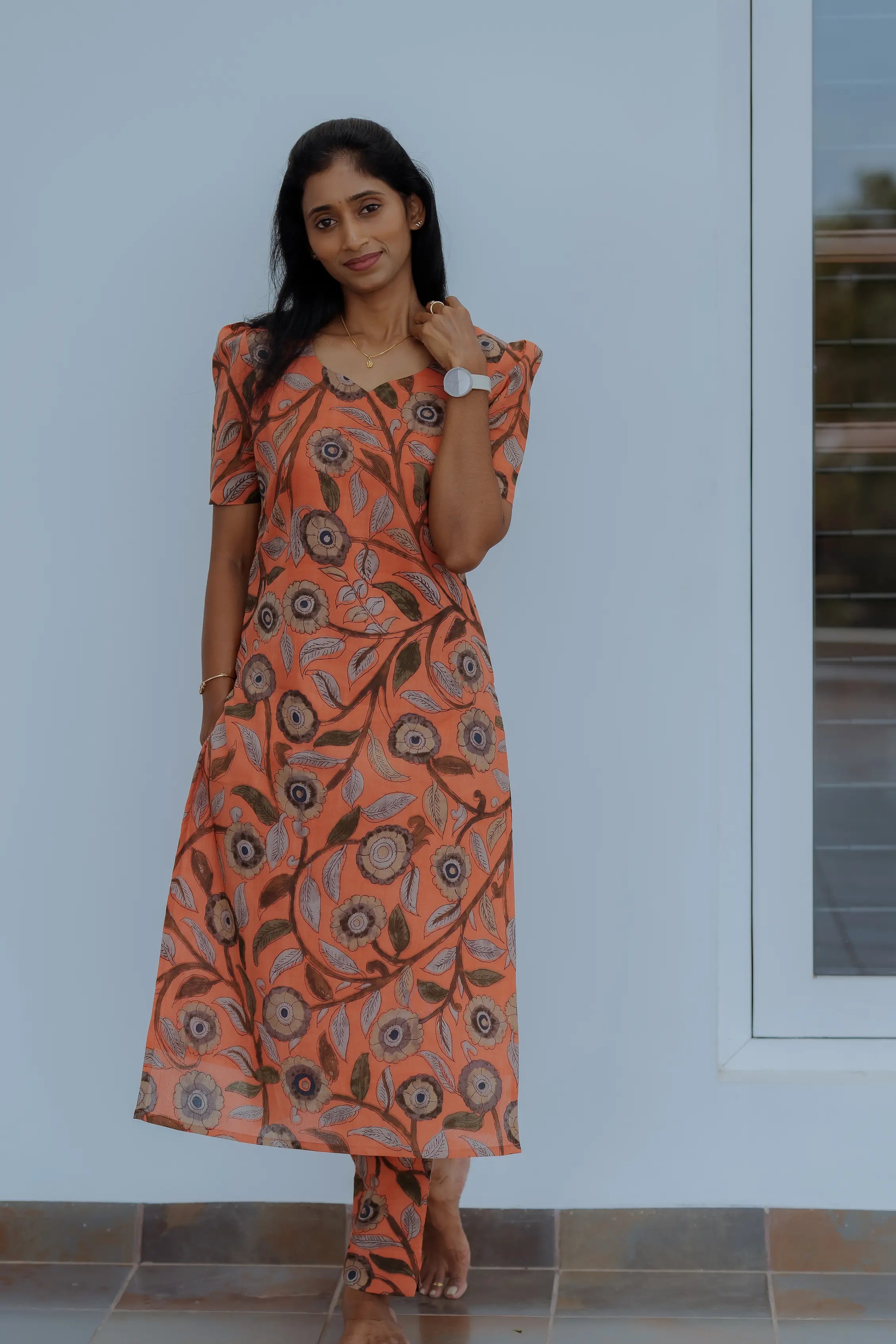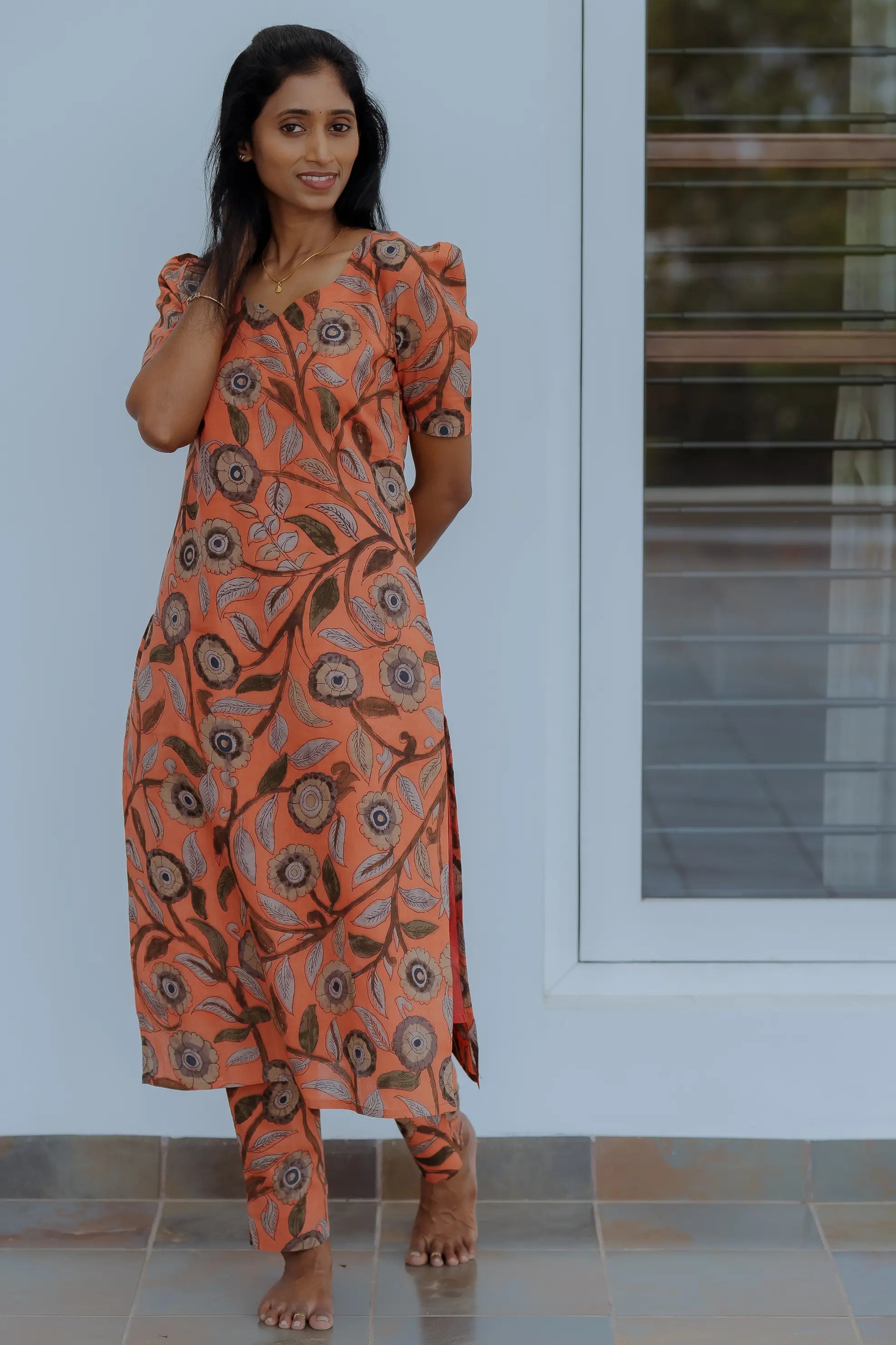 This two-piece ensemble features a beautifully tailored A-line kurta in earthy ochre tones, adorned with intricate floral prints that radiate warmth and charm. The matching pants complete the look, offering ease and effortless coordination.