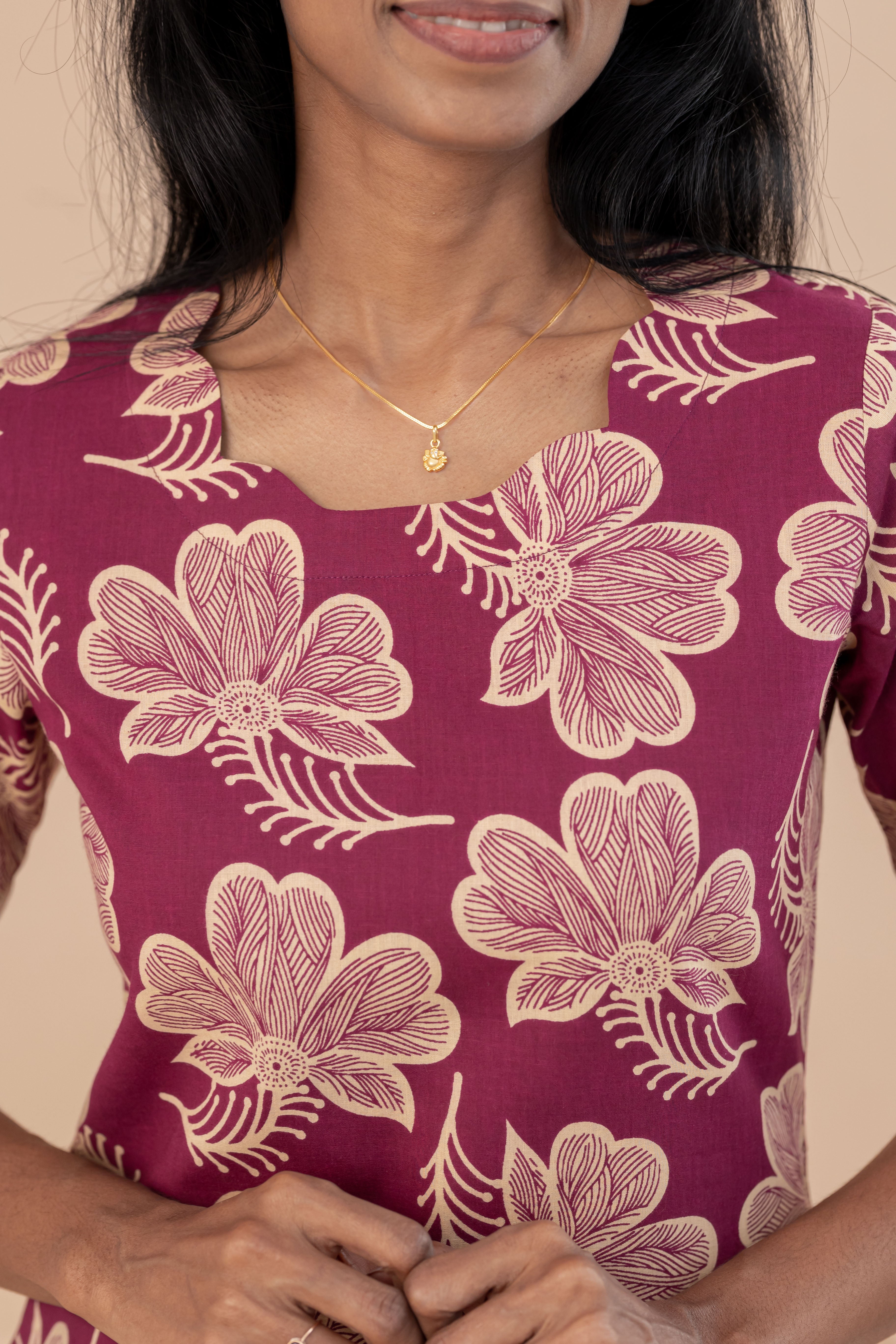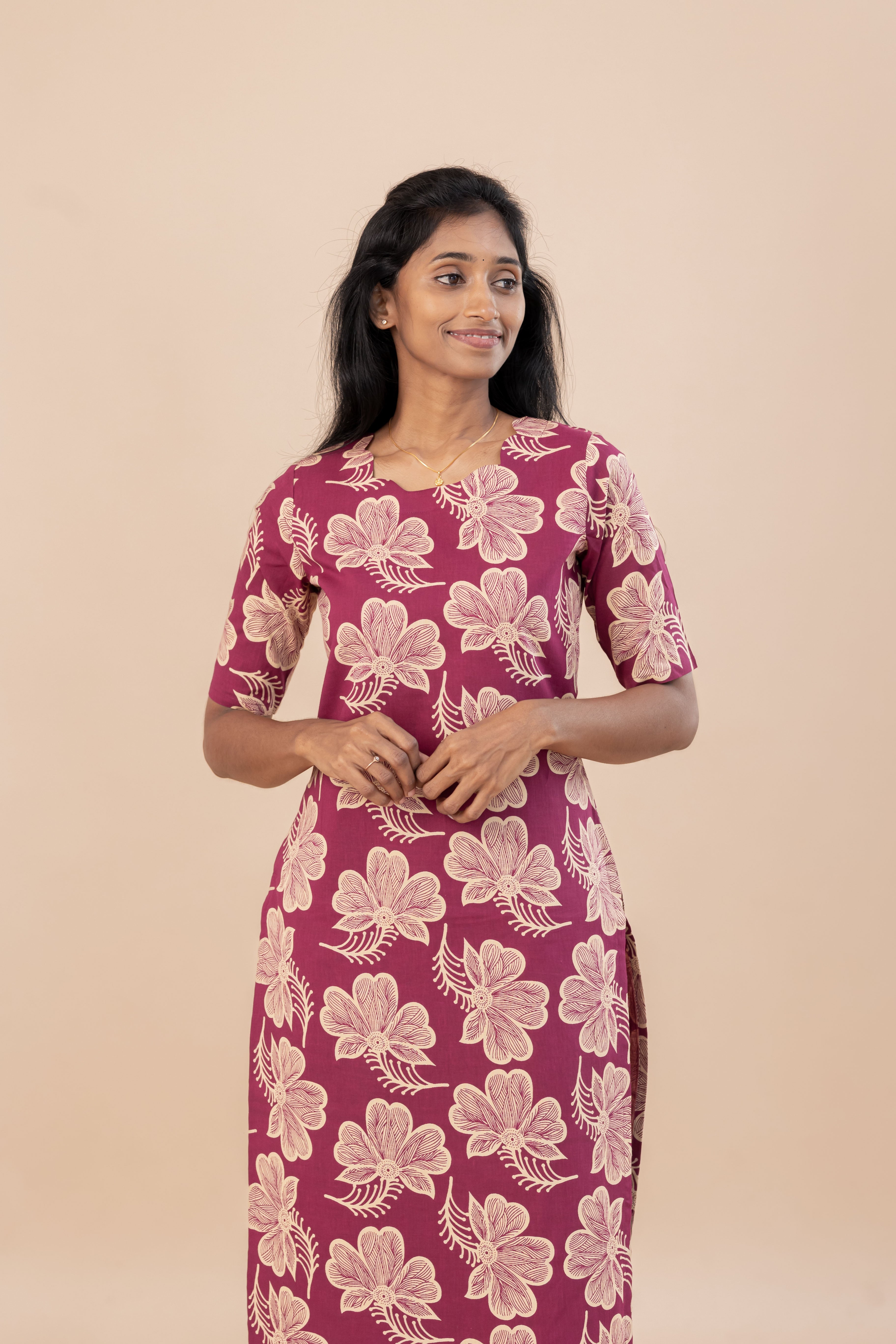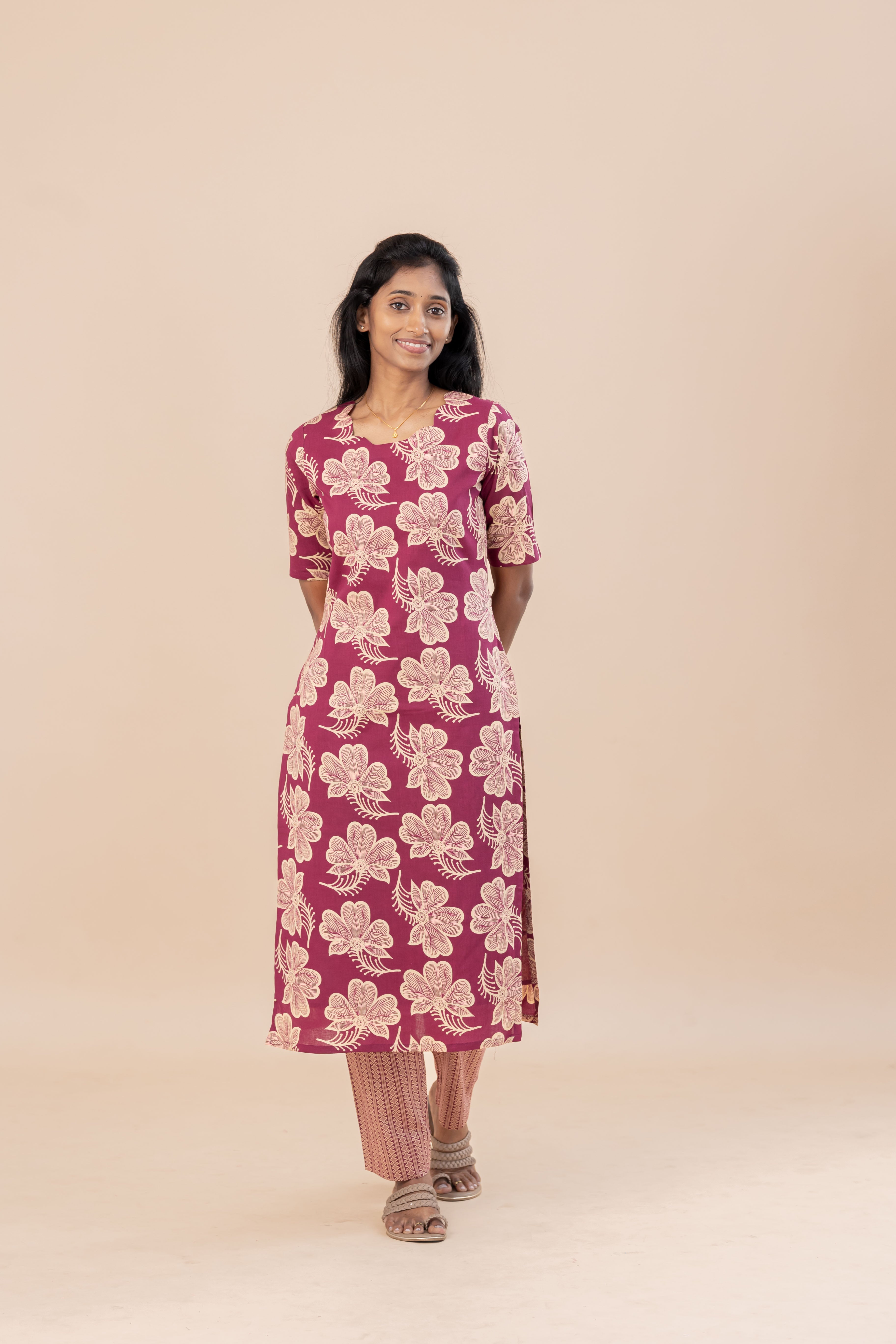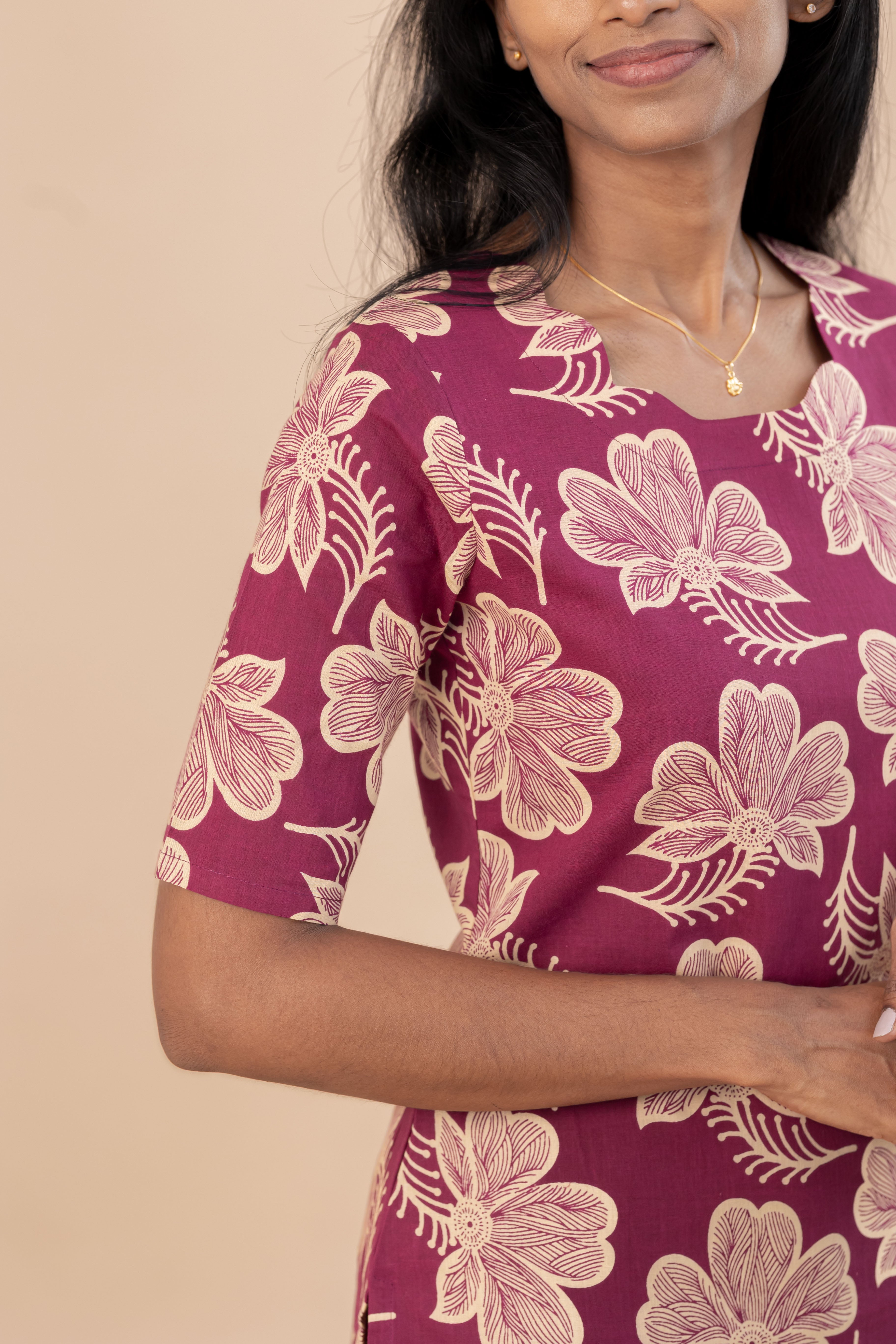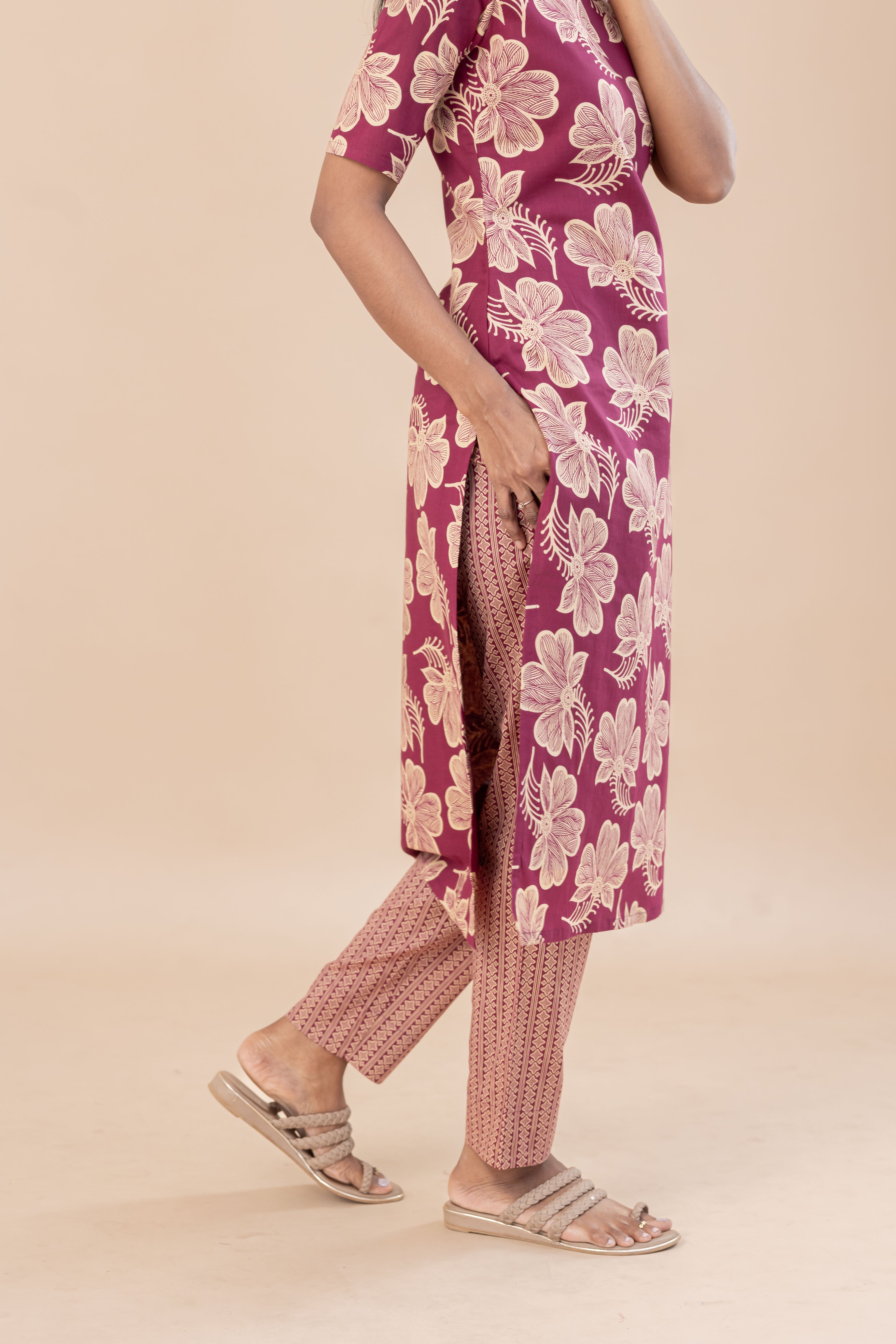 Add a touch of graceful charm to your everyday ethnic collection with the Camellia Co-Ord Set. Designed on a rich wine-toned base and highlighted with elegant floral motifs, this set offers a perfect blend of sophistication and comfort.