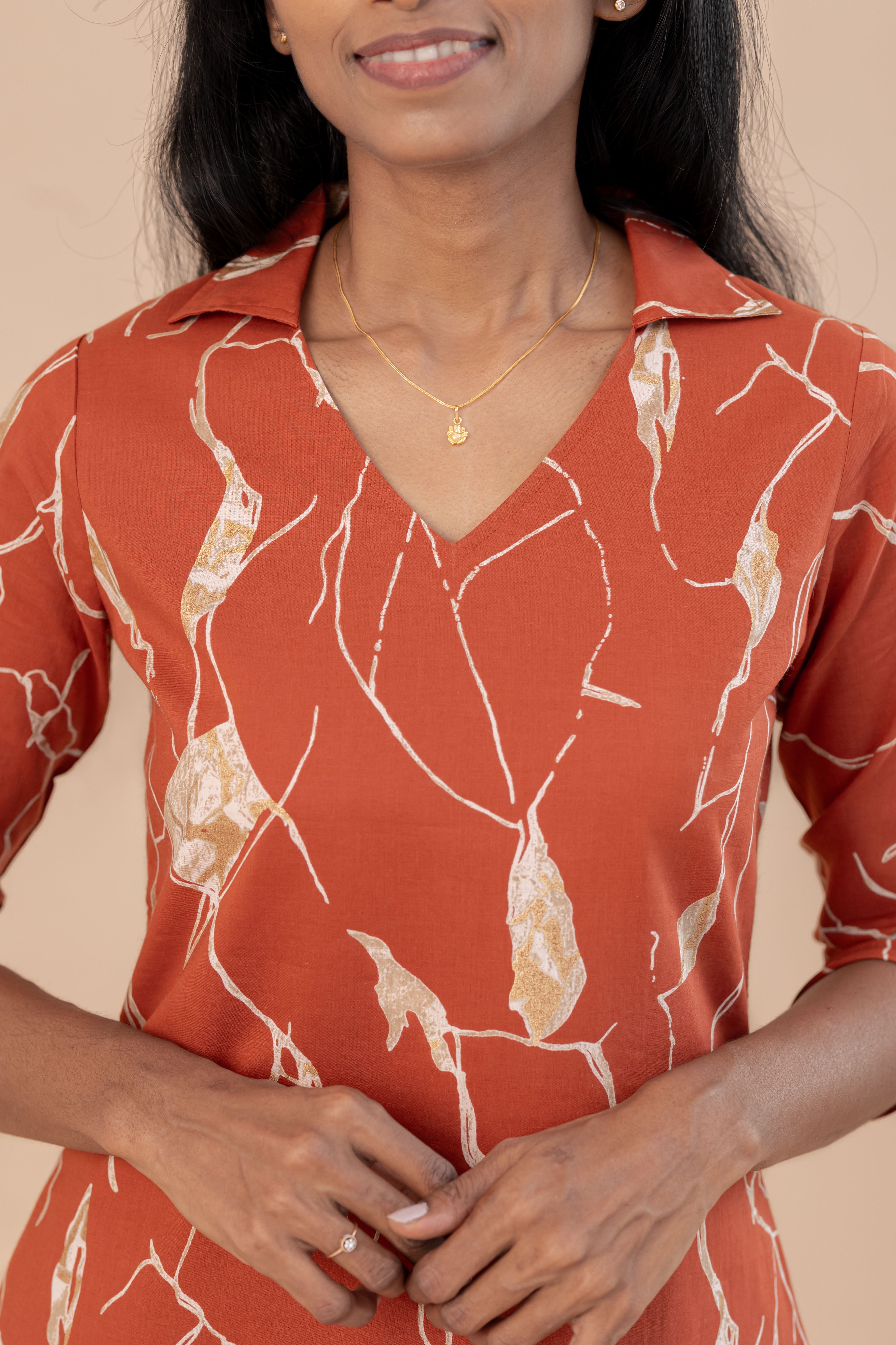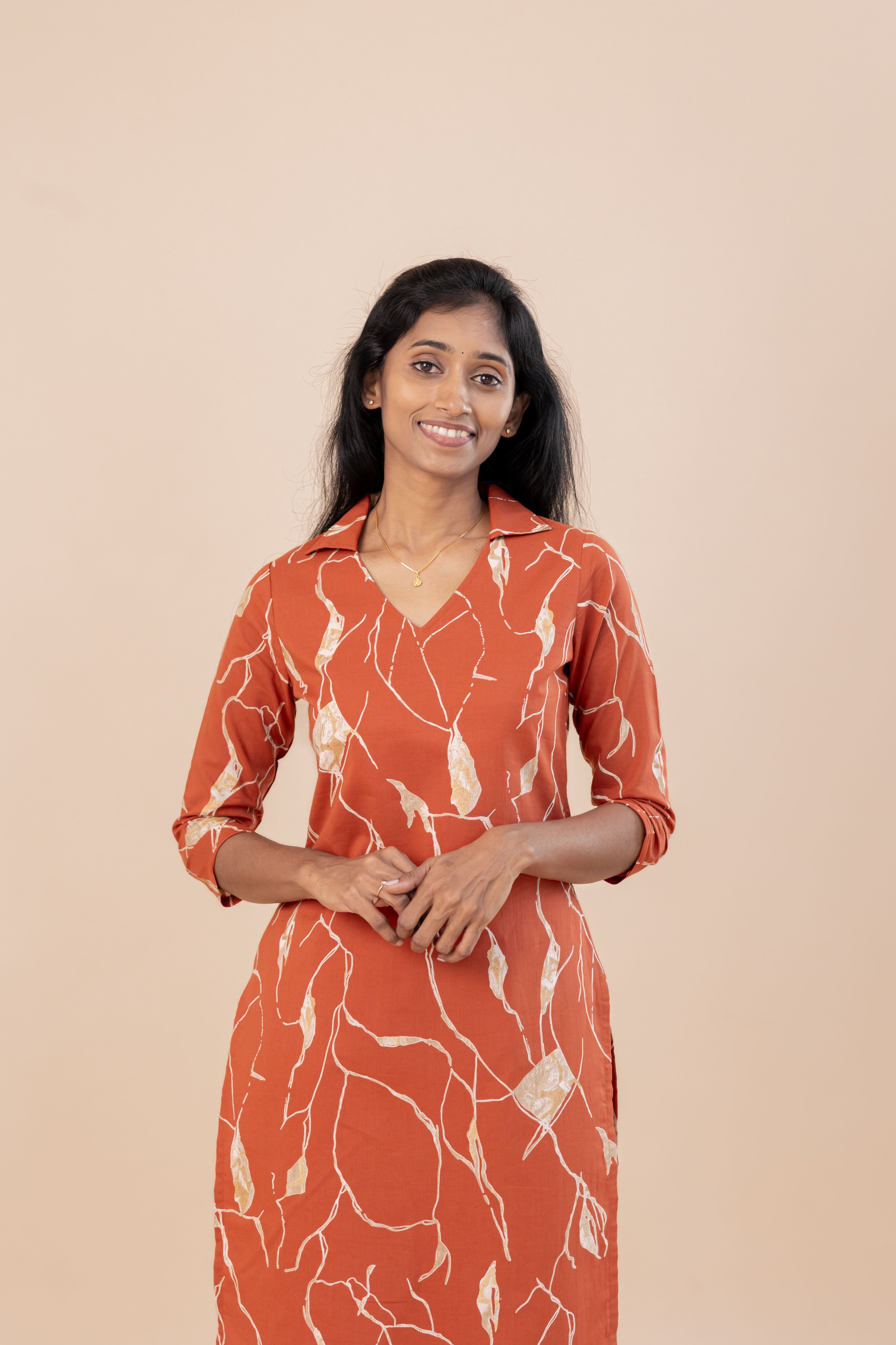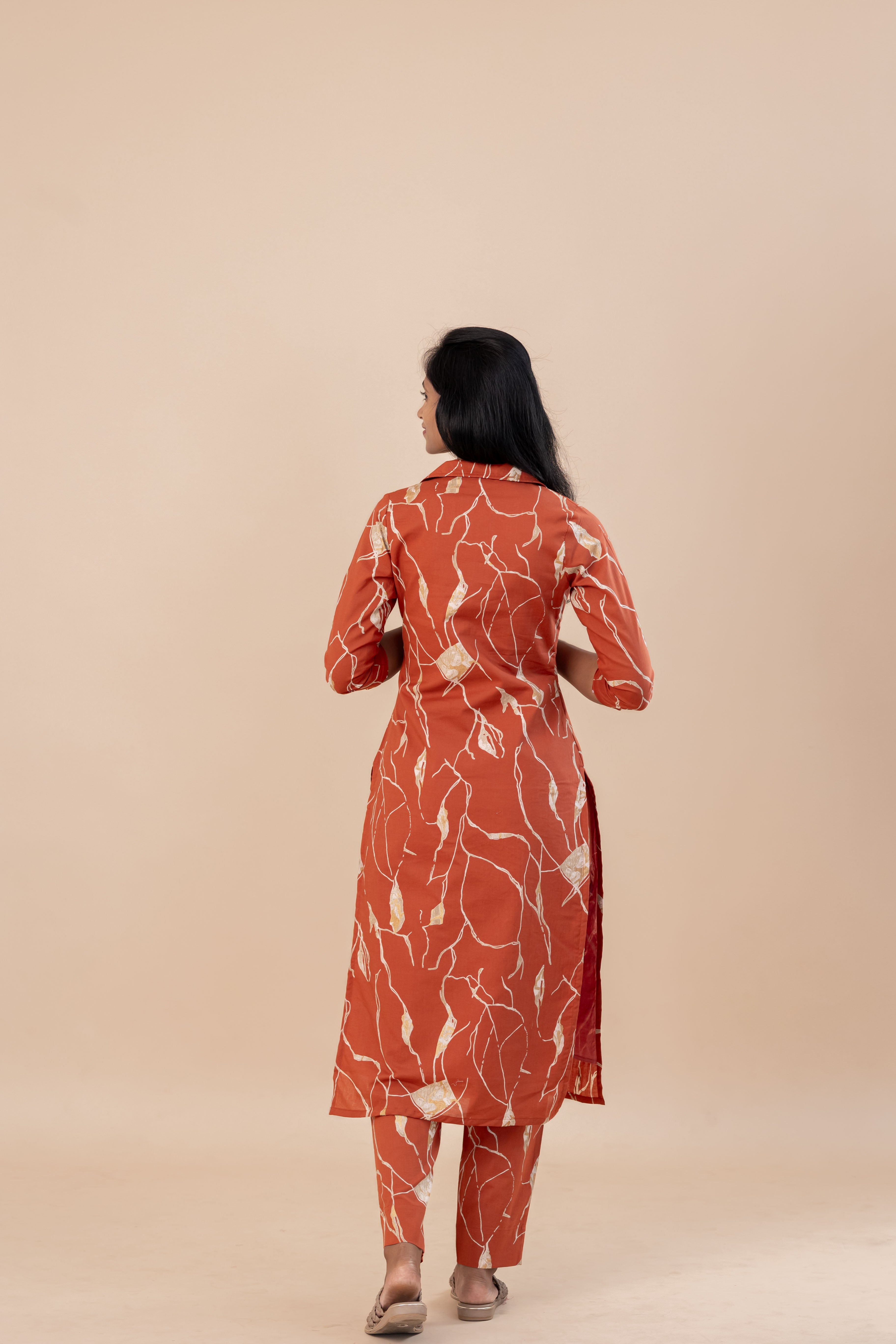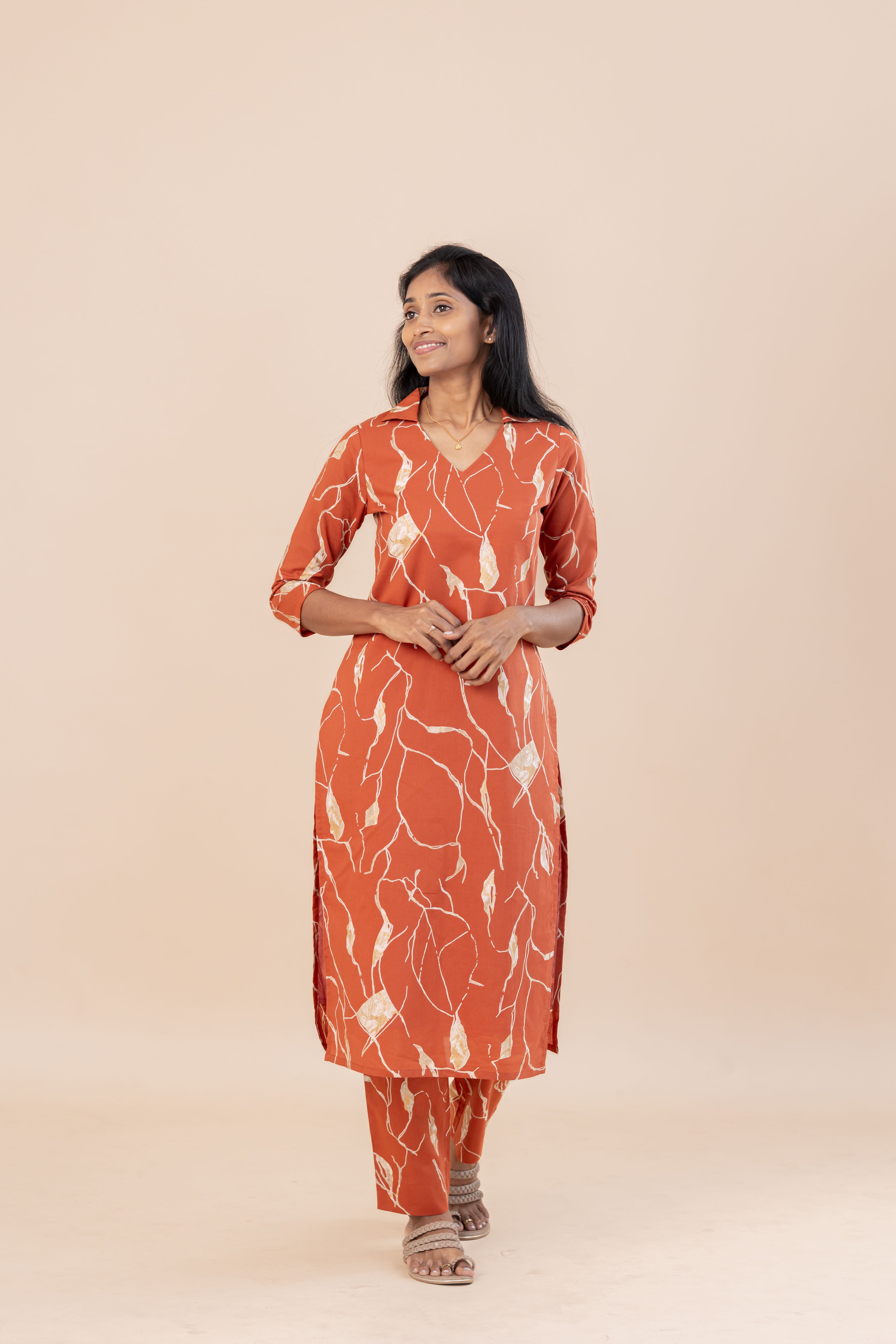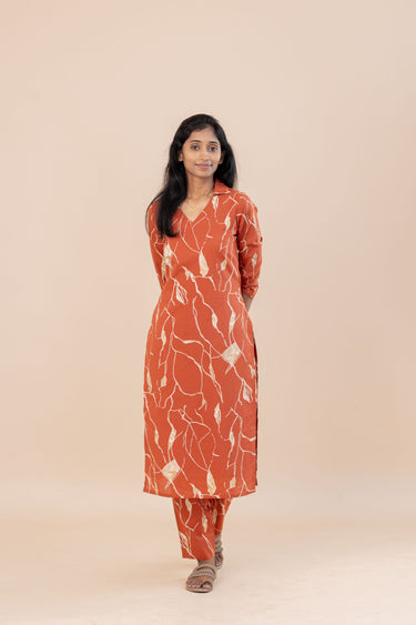 Make a refined style statement with the Fiesta Hibiscus Co-Ord Set, designed for women who love understated elegance. Featuring a warm rust-orange base highlighted with artistic abstract prints, this set brings a modern touch to everyday ethnic wear.
