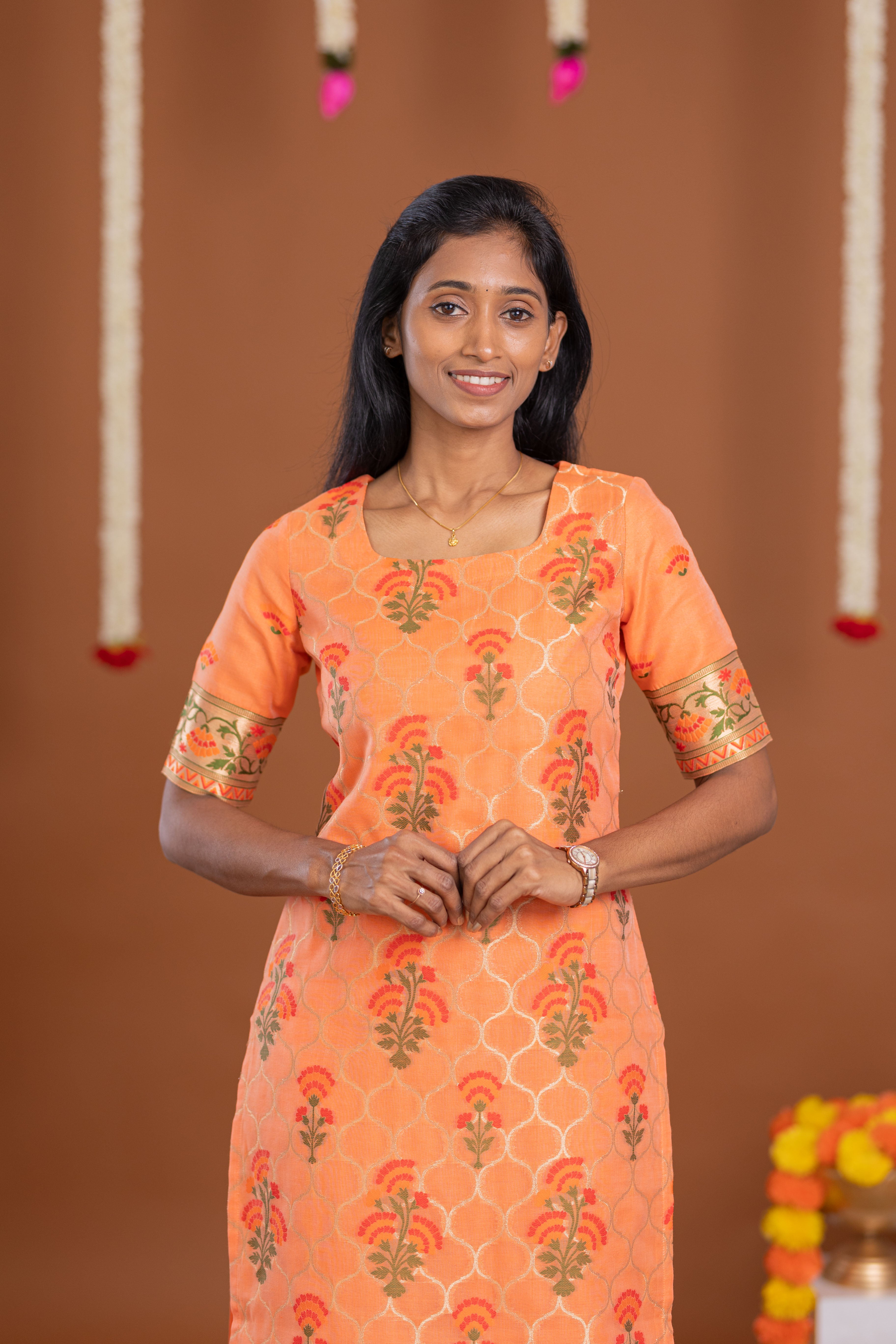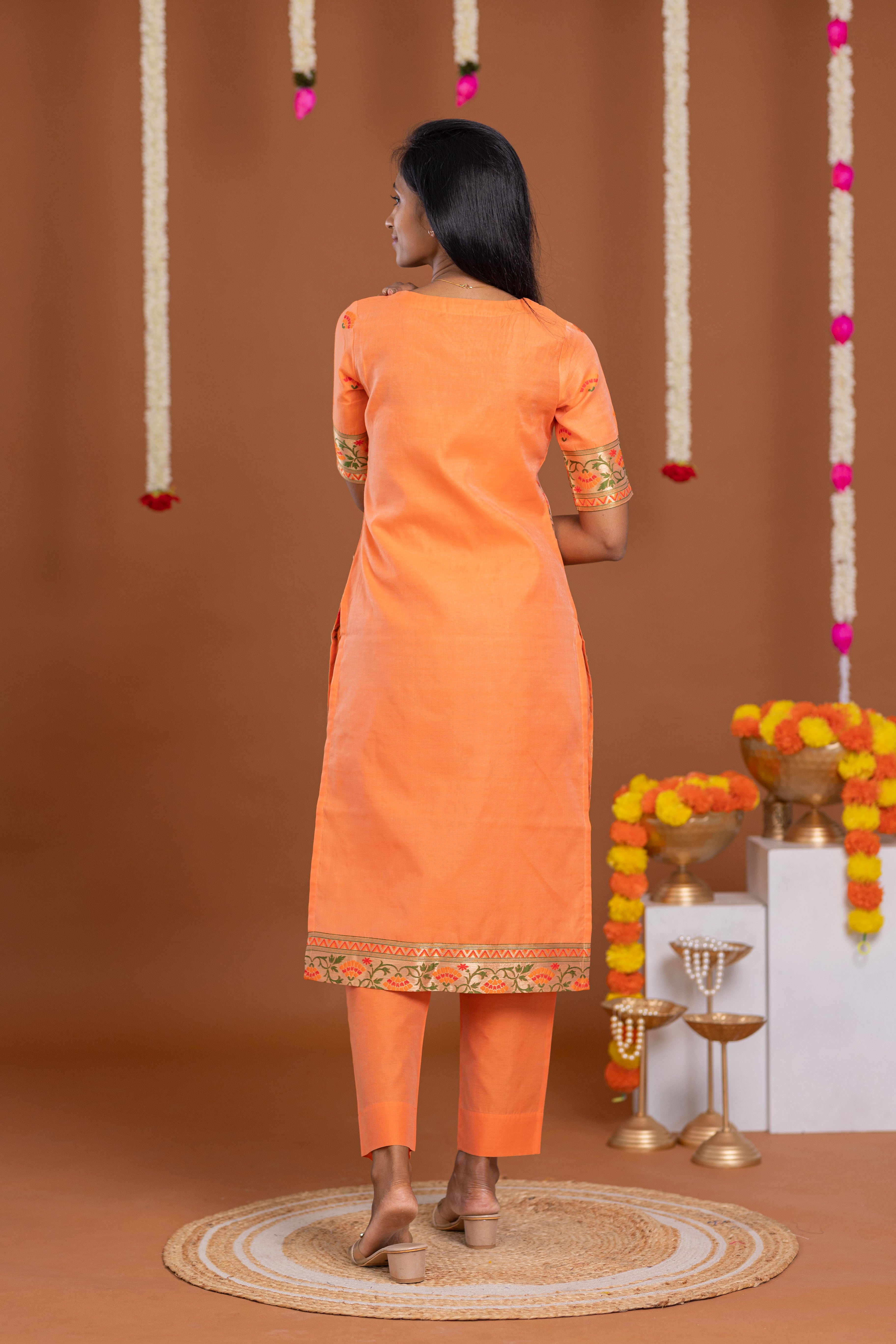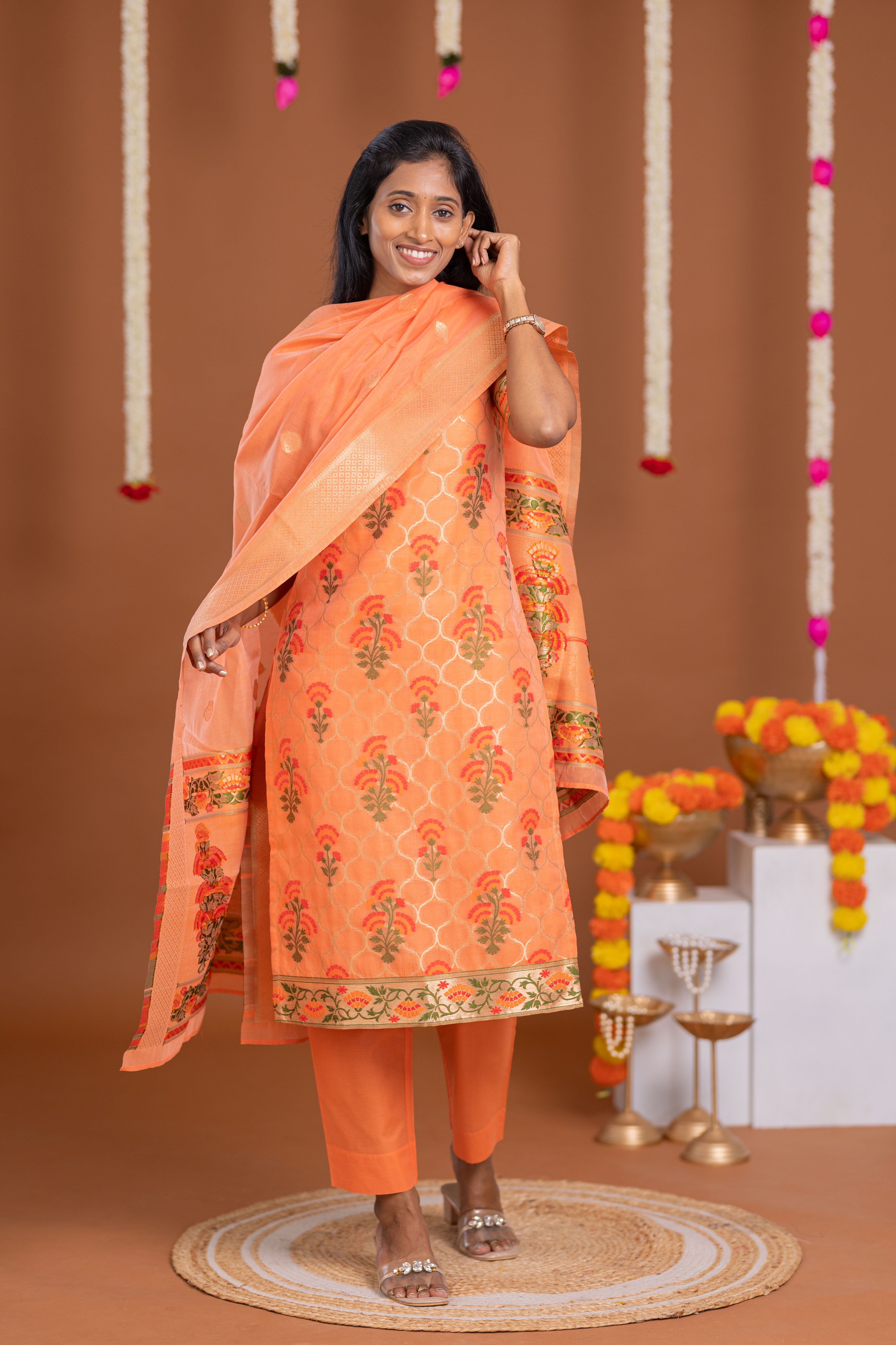 Celebrate the season in soft, radiant style with the Lakshmi 3-Piece Set. Designed in a warm peach palette with delicate floral and heritage-inspired motifs, this ensemble pairs a graceful straight-cut top with matching bottoms and an airy printed dupatta. The silhouette is flattering and comfortable, balancing festive appeal with everyday wearability.