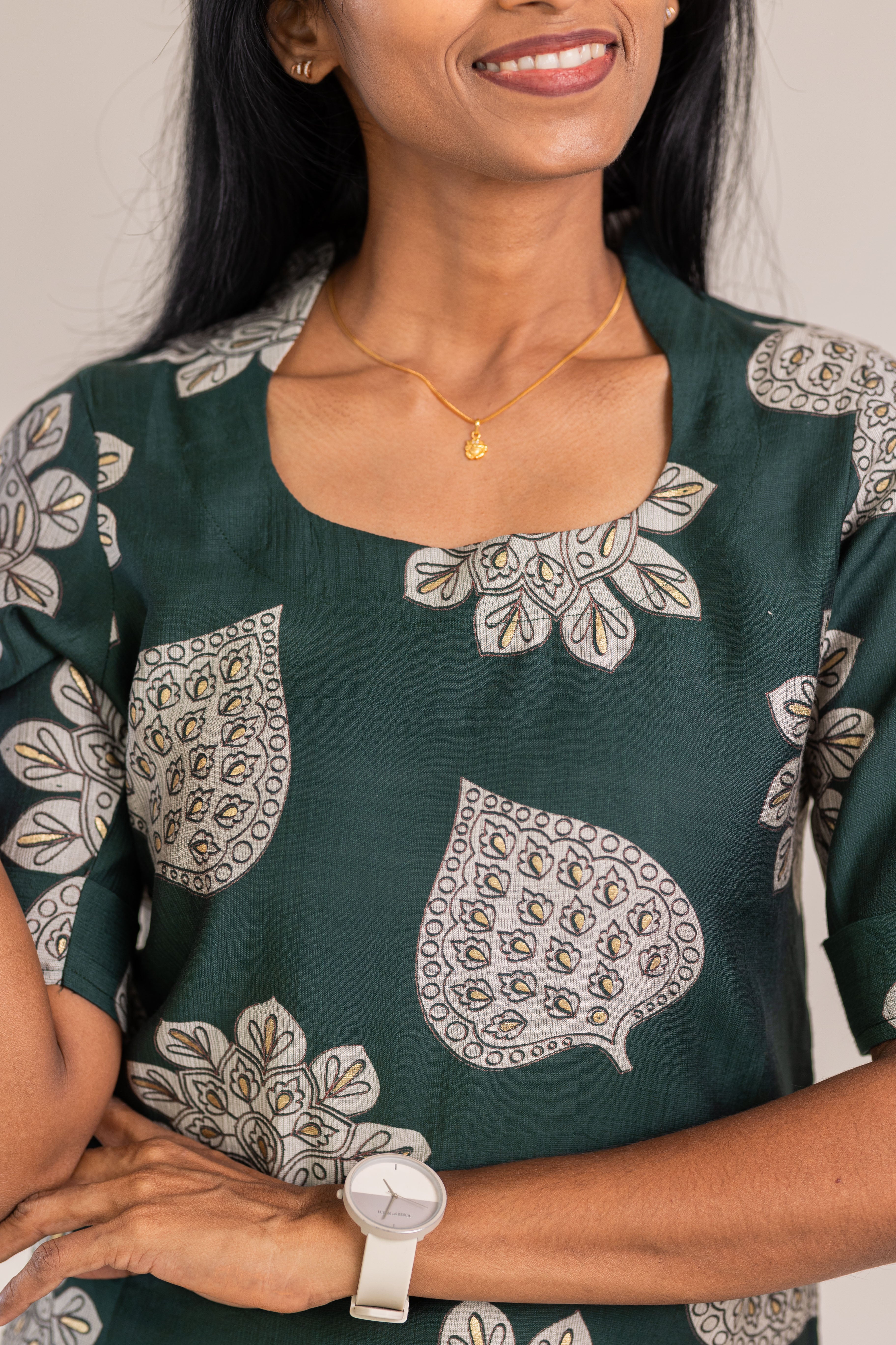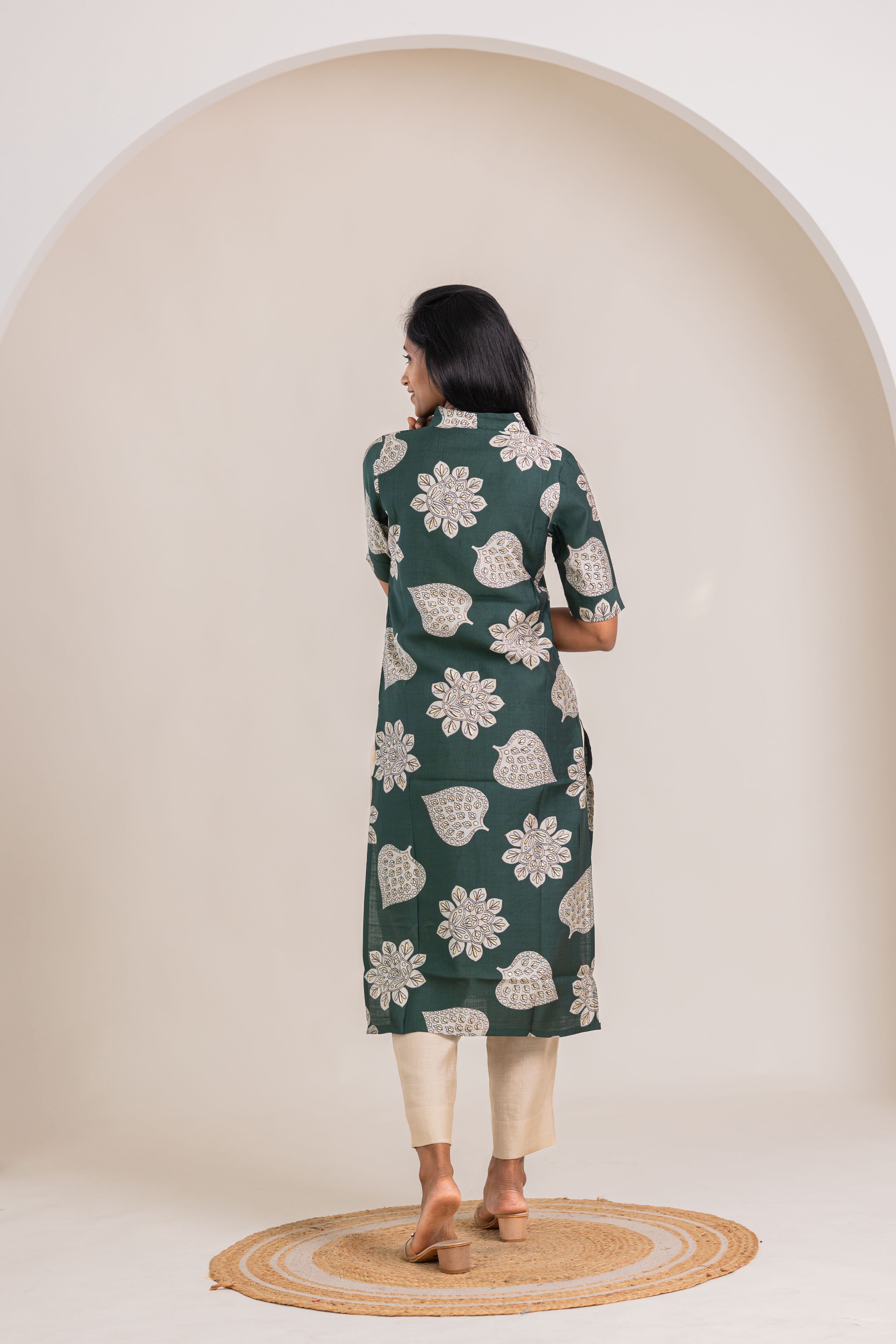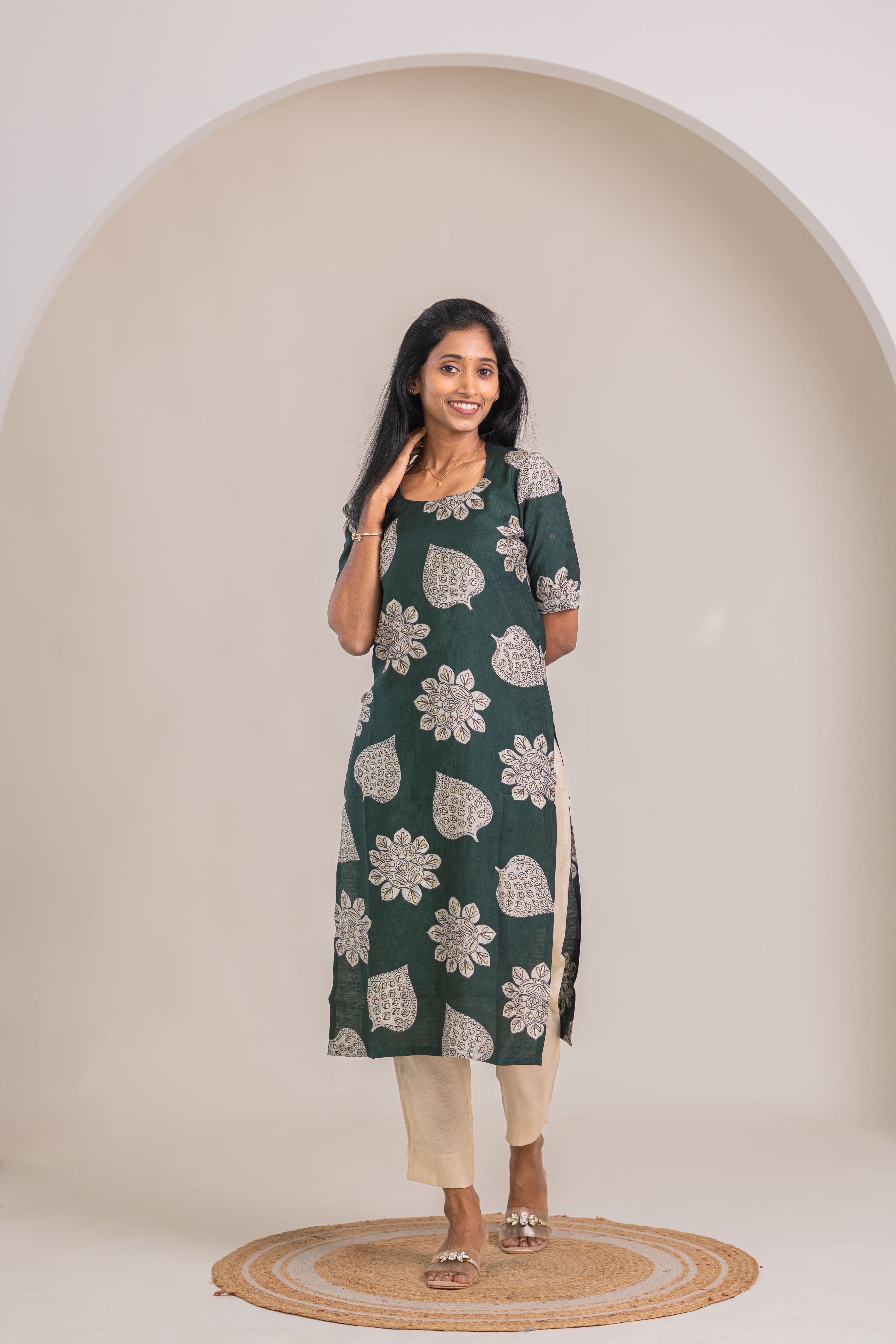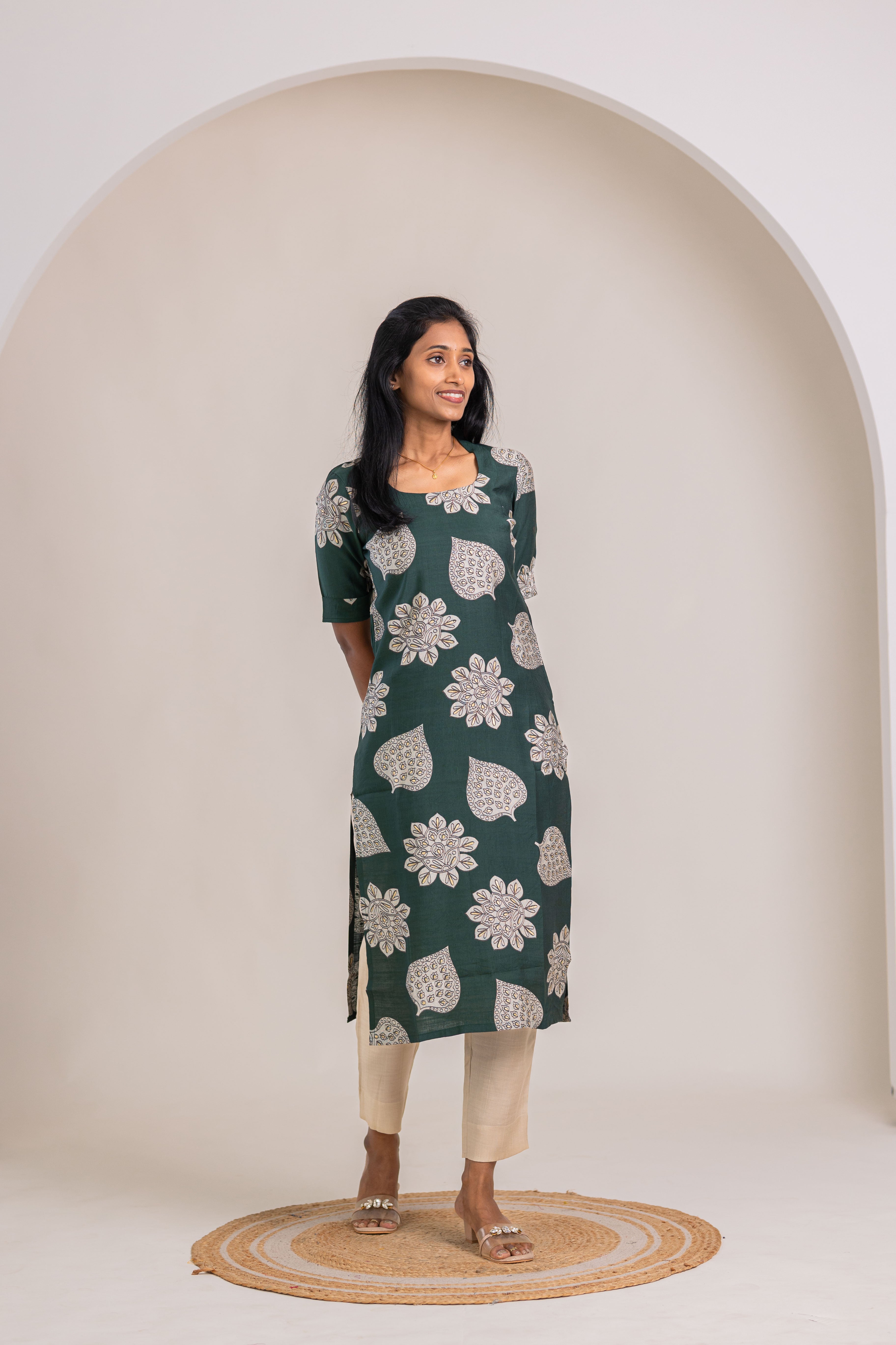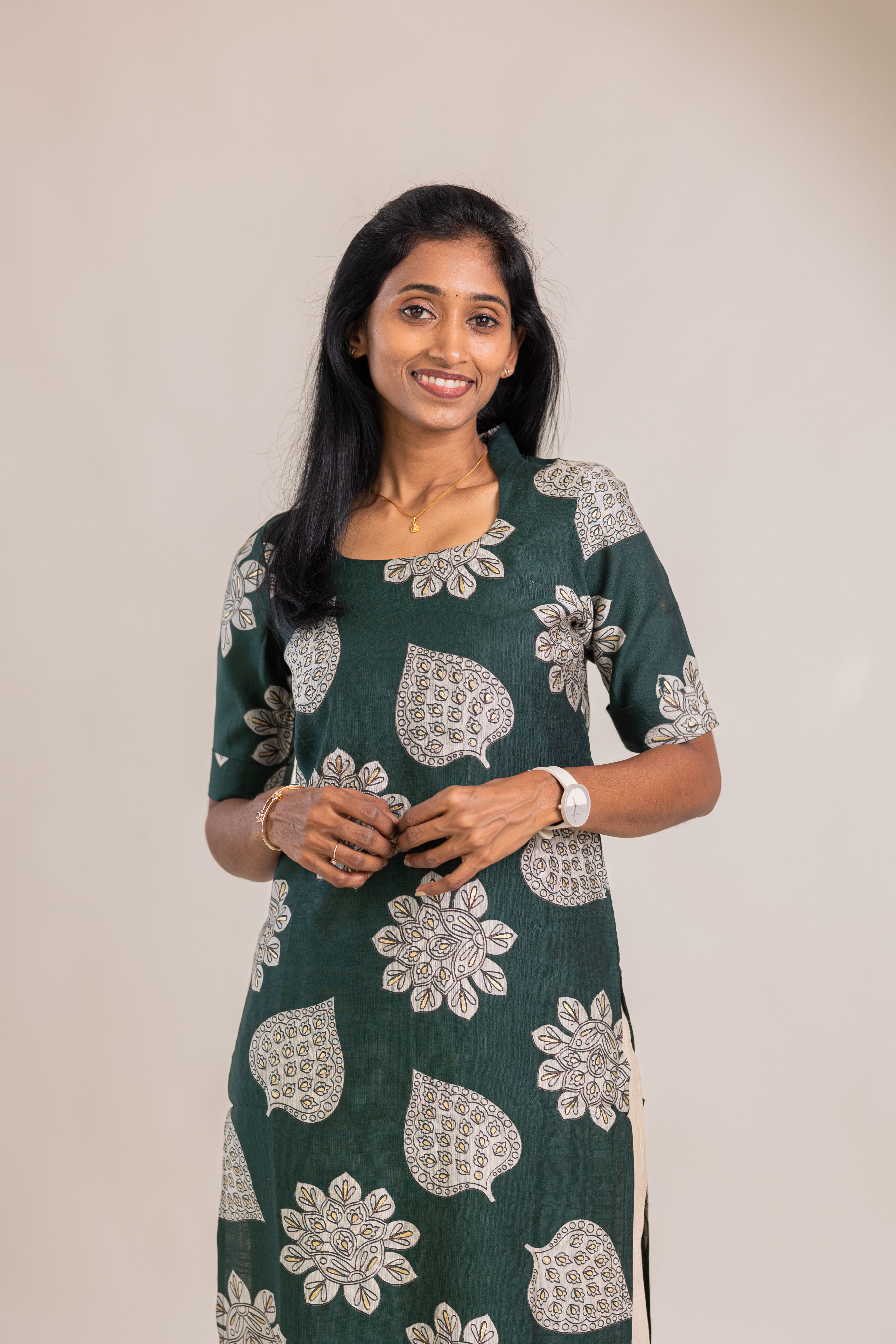 A symbol of elegance and ease — the Maragadham Kurti is where traditional charm meets modern simplicity. Crafted in a soft, breathable cotton fabric, this piece radiates freshness with its serene green tones and delicate floral motifs.